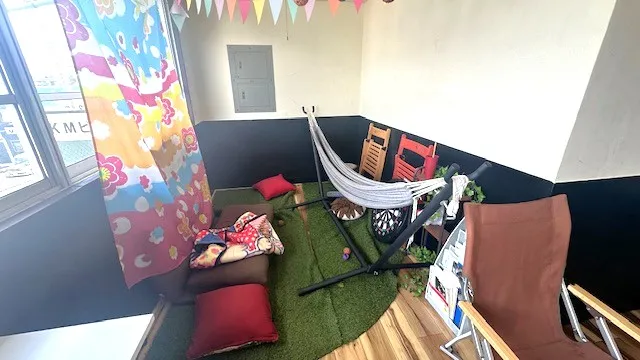 少し隠れたスペースにはゆったりサイズのハンモックを設置しています。 揺られながら窓から空を眺めたり、読書をしたり、ちょっと昼寝をしてみたり・・・使い方は自分次第♪