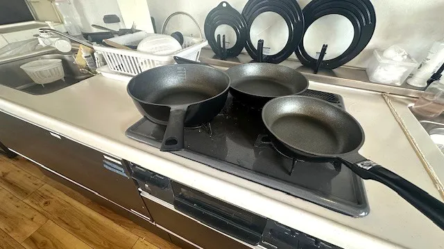 システムキッチンが2台ございます。3口コンロ2台、シンク2台。 その他にも共用冷蔵庫、オーブンレンジ、トースター等の家電も充実しております。