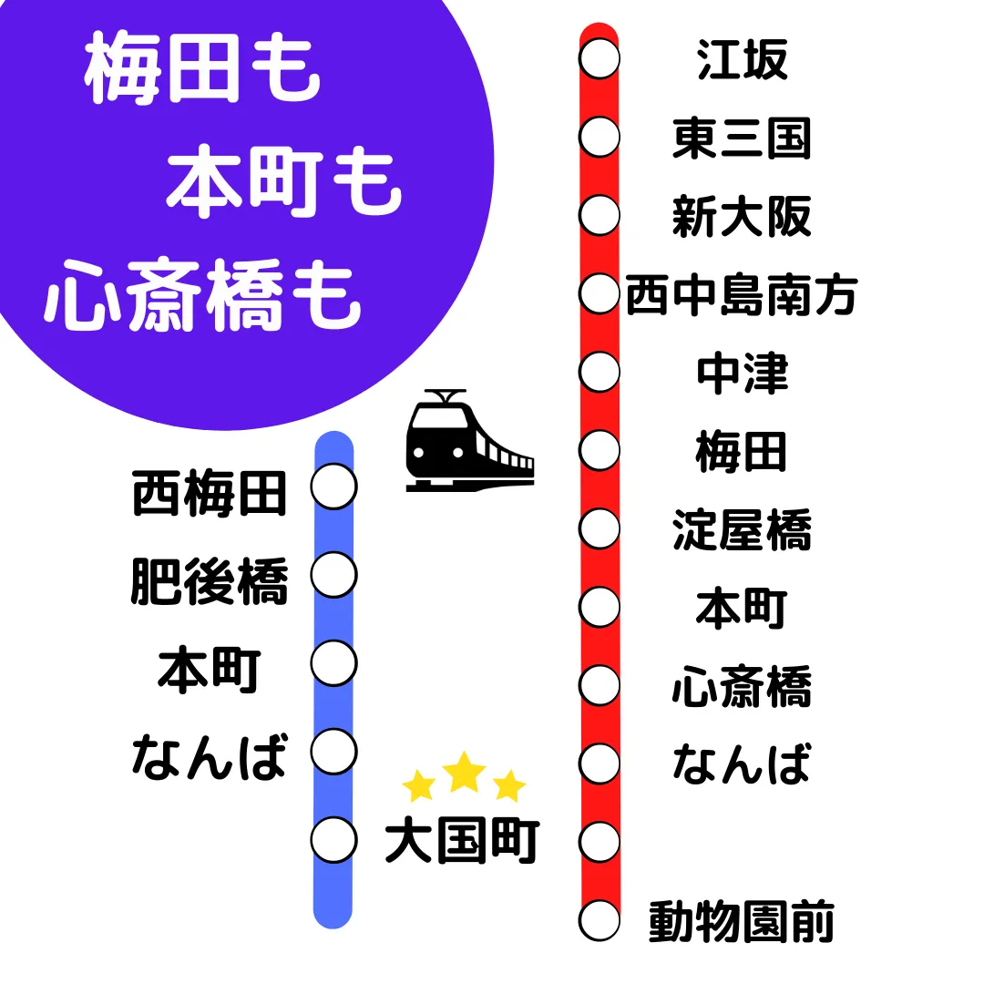 大国町は御堂筋線と四ツ橋線が走る便利駅。なんばまでは一駅分歩いて通えるし、JR環状線芦原橋駅も徒歩15分内です。