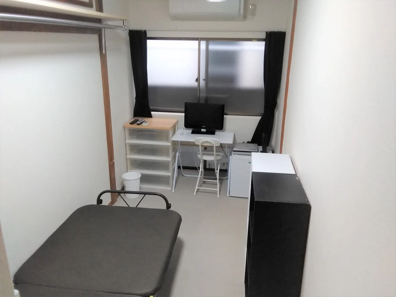 全てのお部屋にエアコン、ベッド、テレビ、冷蔵庫(小)机、椅子、衣装ケース、本棚、吊棚、物干し、各部屋1回線のネット環境・Wi-Fi機器等を設置済