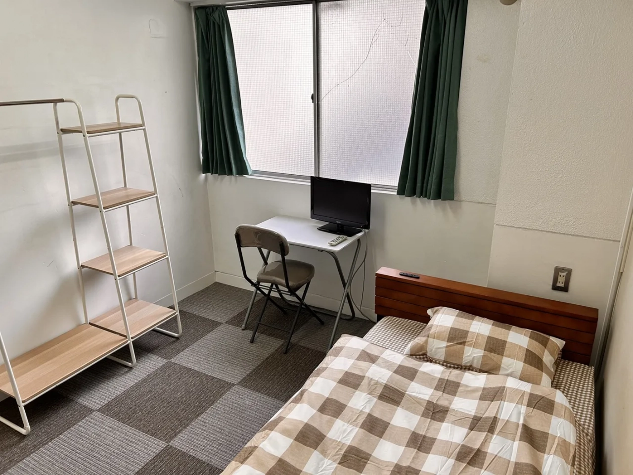 設備:エアコン、机、棚、テレビ、冷蔵庫、ポールハンガー、寝具一式等。