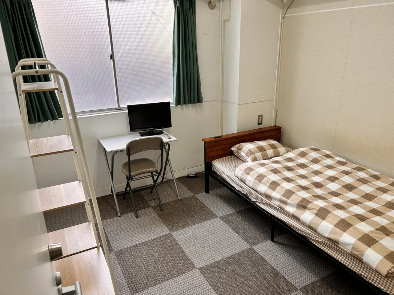 設備:エアコン、机、棚、テレビ、小型冷蔵庫、ポールハンガー、寝具一式等。