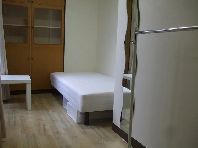 1F。 床材は洋室(CFフローリング)。ベランダからお庭に出られます 。保証金から退去時クリーニング費として¥22,000償却。 無線LANあり。備品:エアコン、ベット、テーブル、カーテン、姿見。※普通借家契約1年(自動更新)
