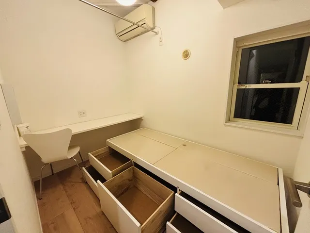 部屋には、エアコン、ハンガーラック、カウンターテーブル、椅子、収納ベッドが備え付け