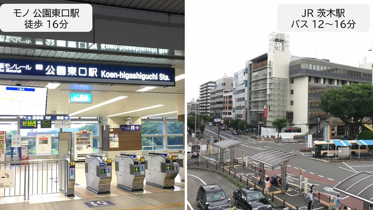 モノレール公園東口駅とJR茨木駅。ハウス周辺に豊中駅に向かうバス停もあり。