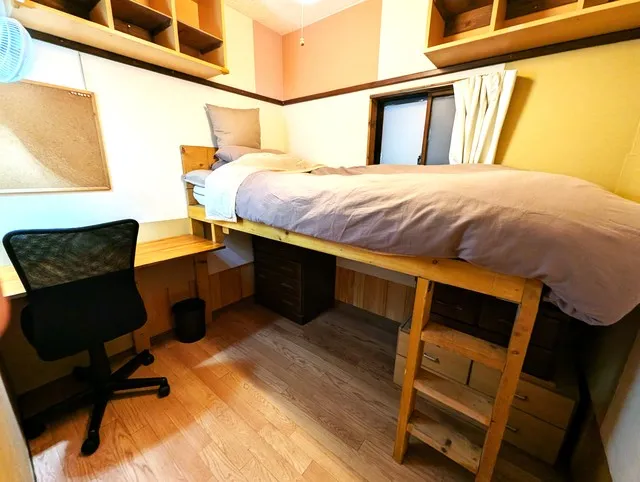 6号室入居可能 活気と元気エナジーの街に住んでみませんか? JR高円寺北口から究極の徒歩1分の便利でいつも清潔に保たれているウッドと和の穏やか キュートなデザインのシェアハウス高円寺の個室達です。アクセスはJRで新宿まで7分 駅近に加え当ハウスはウッドと和の色調で整えた大変居心地の良い穏やかなデザインで自由人の為空間です。自慢のルーフテラスは楽器練習 ヨガさえ出来るお花と緑の心地よい空間 WIFIも届きます。 各室小型の個室ながら全てが揃っているデザインの良い暖かいお部屋です。プライベート感プライバシー性の高いハウスデザインです。 各室/防音壁仕様 によりよっぽどでないと隣室とのジャマも無くストレス減。AC 全館WIFI デスク ベッド/タンス等作り付け大変使いやすく設計 短期~長期対応でプライベートな生活を営める様設計されております。各部屋デジタルロック任意番号設定安心かつ鍵を無くす心配無し。自慢のルーフテラスは都心のオアシス太陽一杯お花と緑を配し大変憩いの場。ヨガは勿論 楽器の練習さえ可能。 ★ 布団セット シーツ類 ご希望の方無料貸し出し( 退出時完全殺菌洗濯済み ) 都会のオアシス駅近シェアハウス