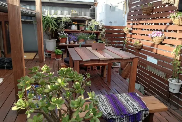 植物好きな人には好評、自慢の ルーフトップのバルコニー。御食事 ヨガはもちろん楽器の練習さえ可能です。