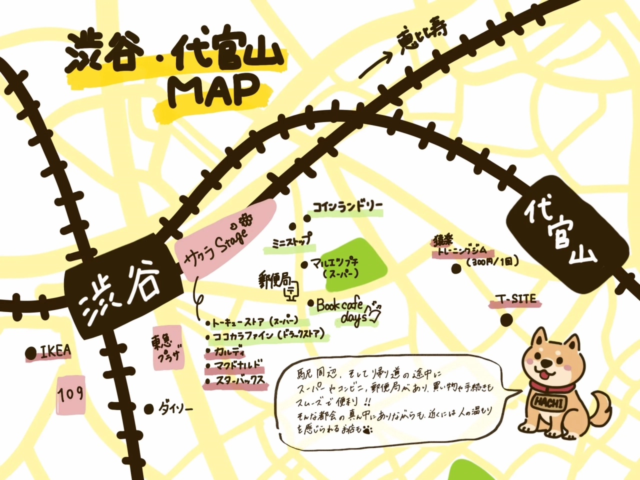 渋谷駅から徒歩7分、代官山駅へも歩いて行ける便利な立地。スーパーやコンビニ、郵便局が近くにあり、毎日の買い物や用事もスムーズに済ませられます。