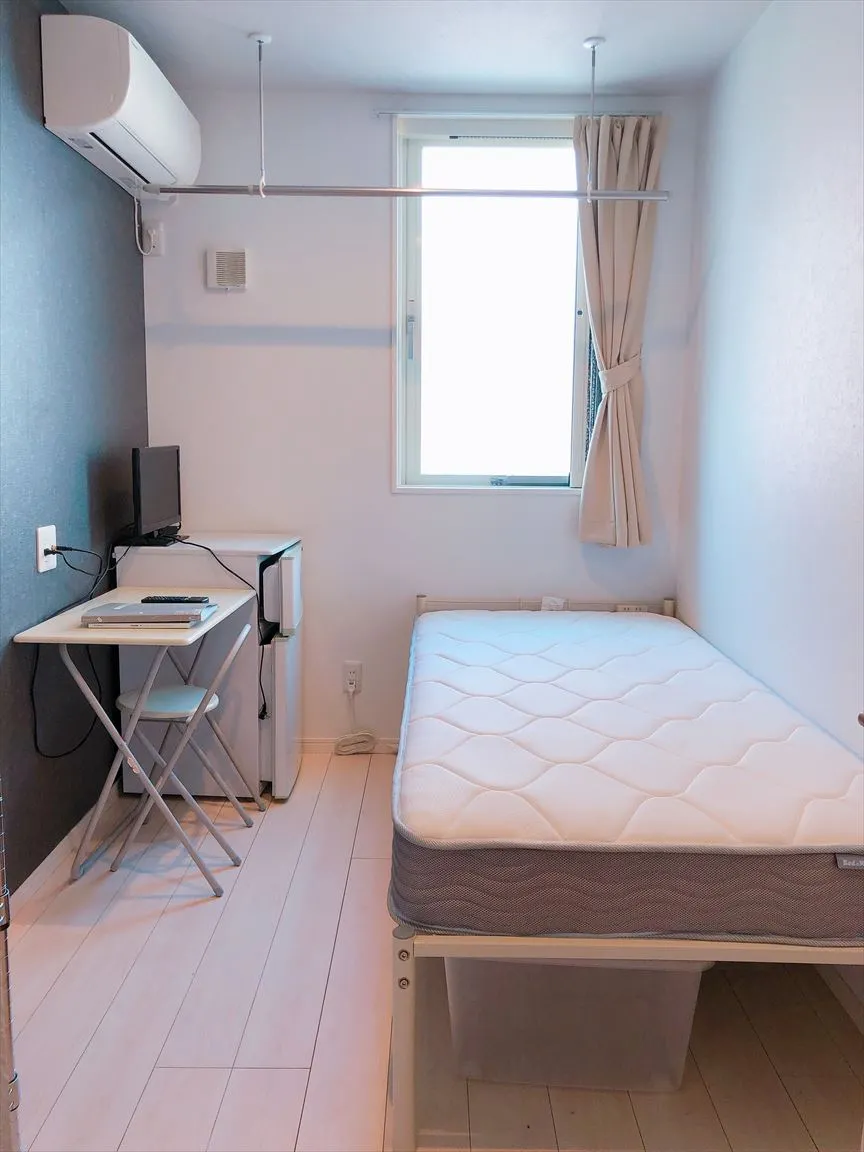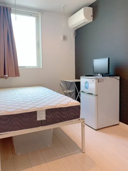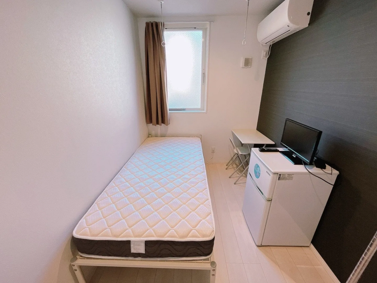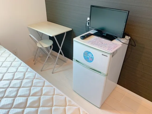 シンプルなお部屋はこちら! 各部屋に冷蔵庫・テレビ・ベッド・机・椅子を完備しているので、身一つで入居できます!