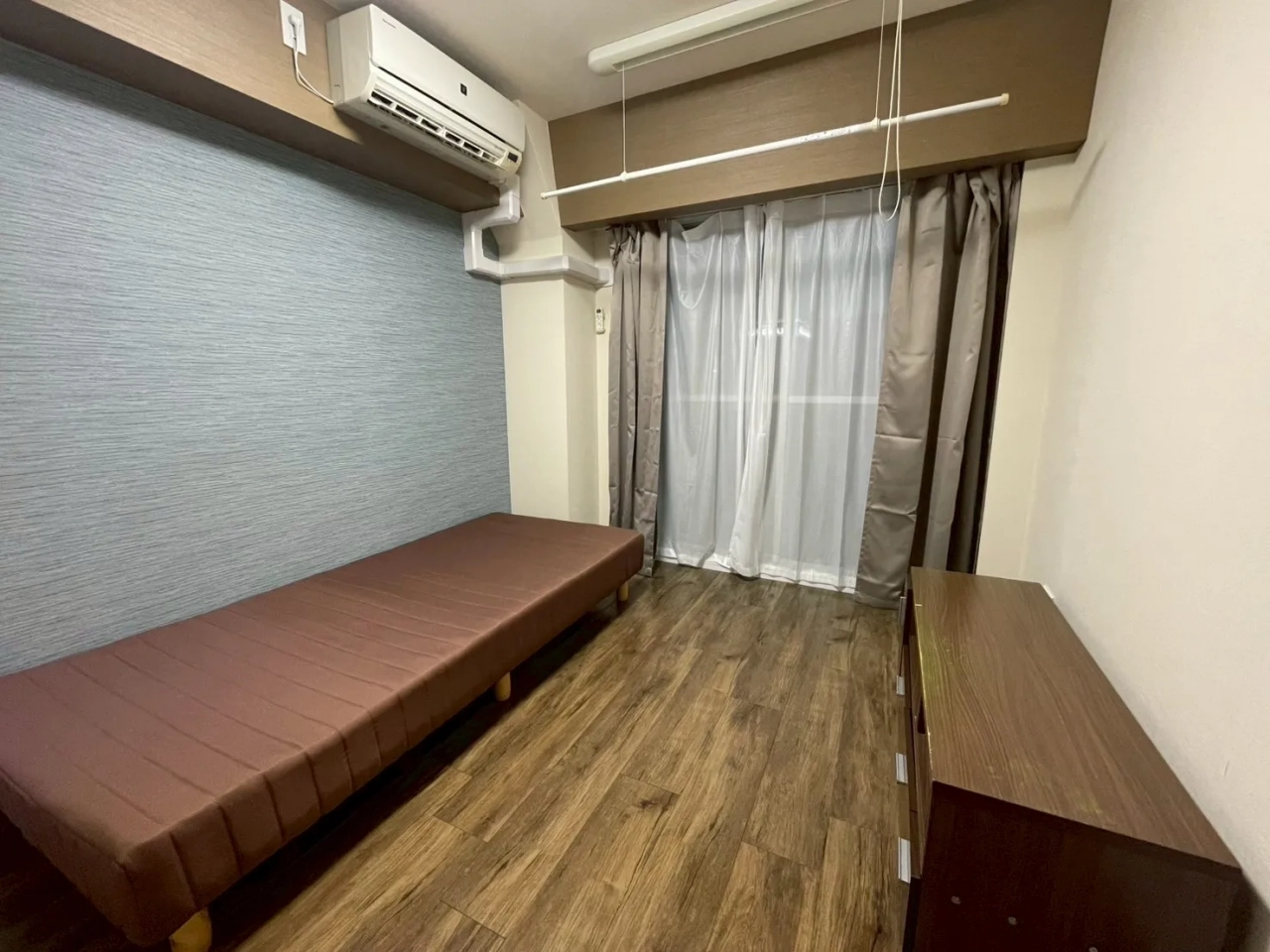 個室設備:エアコン、テレビ、テレビ台、机、椅子、ベッド、照明器具、吊り下げ室内物干し