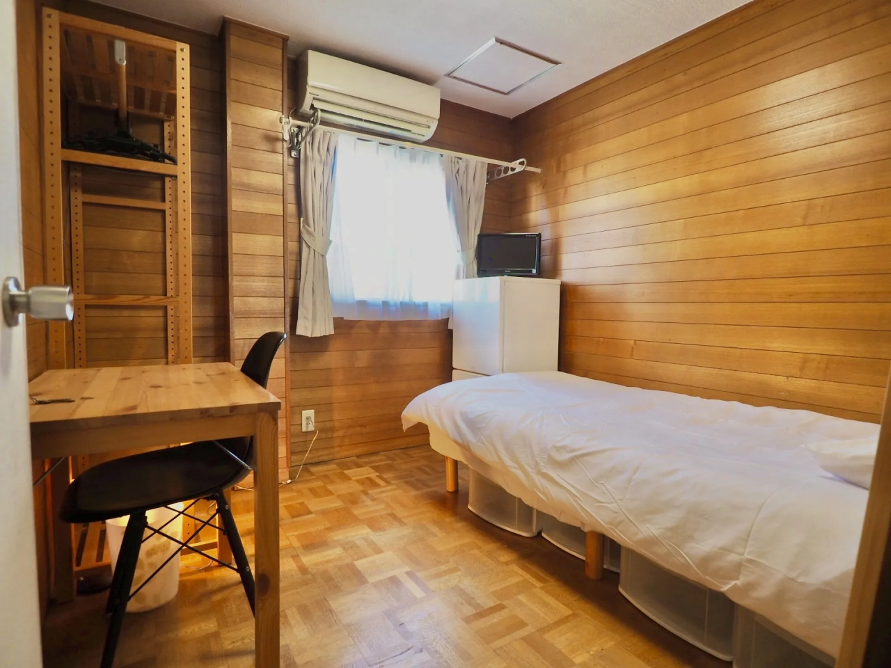 個室にベッド・机、TV・冷蔵庫付。共用部の消耗品も家賃に全て込みです。