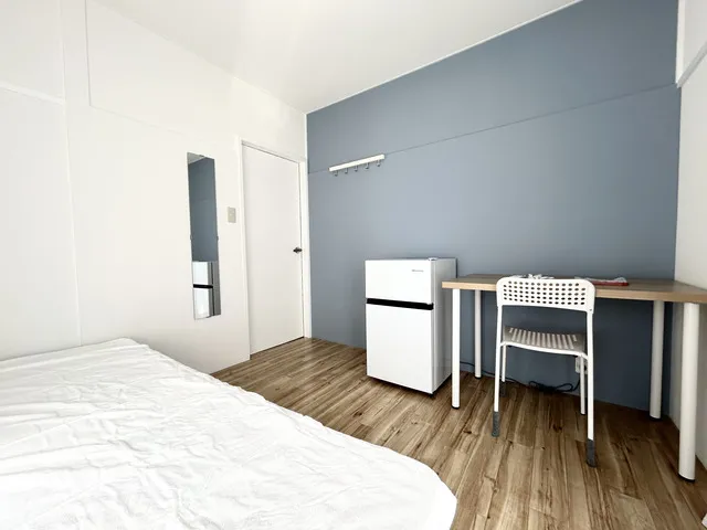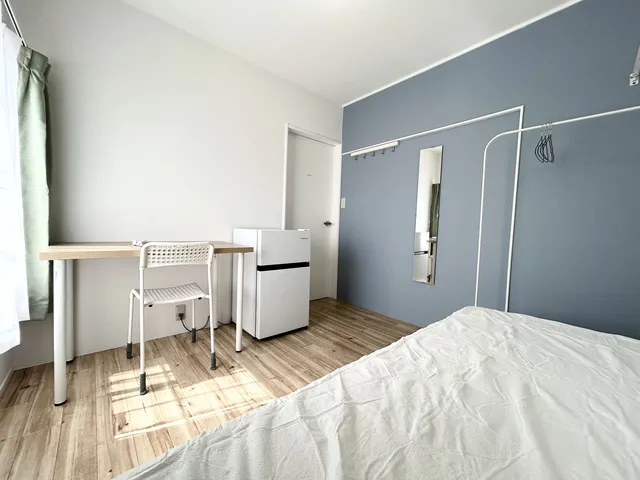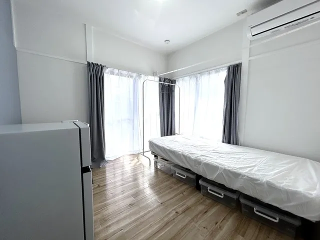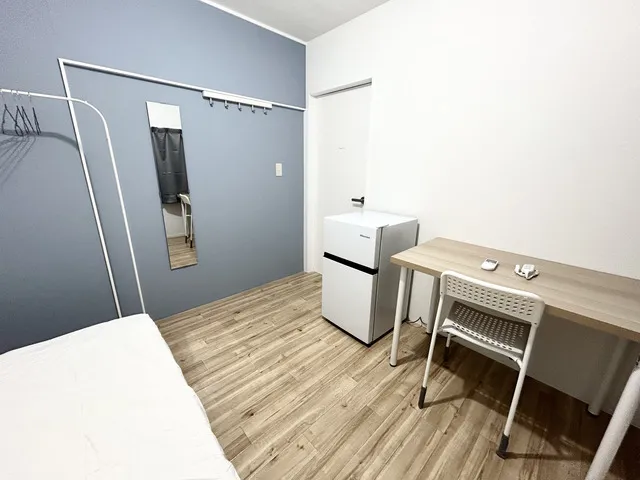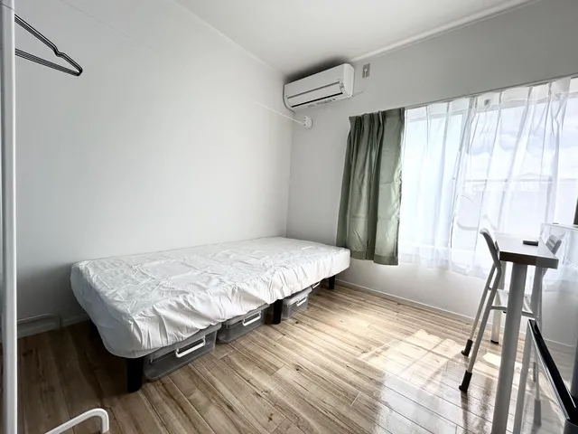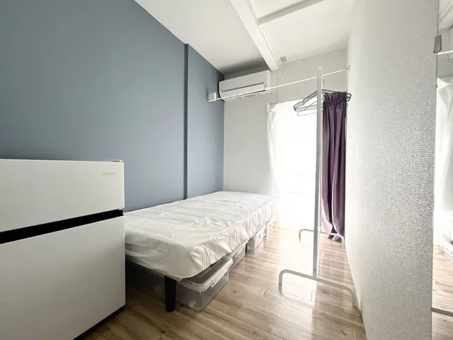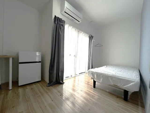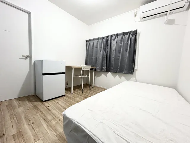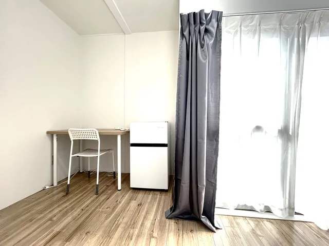 ★備品:冷蔵庫、デスク、チェア、ベッド、収納、エアコン、照明、カーテン、ウォールフック、ハンガー、洗濯物干し、電源タップ