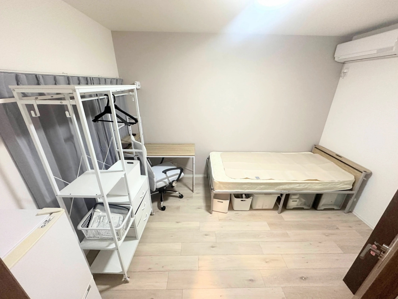 【在宅ワーク仕様】幅広デスク&オフィスチェア完備!長時間作業しても疲れにくいです!冷蔵庫、鏡、室内干し用の物干しまで完備!タンスワードローブ&ベット下収納あり!遮光カーテン&分厚いマットレスで朝までぐっすり。*デスク種類とイスは部屋によって異なります。詳細は各部屋の写真ご確認ください。