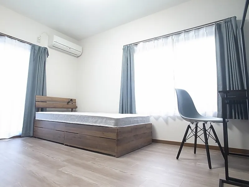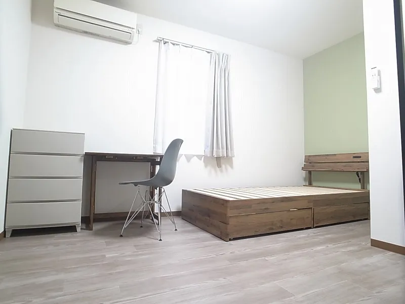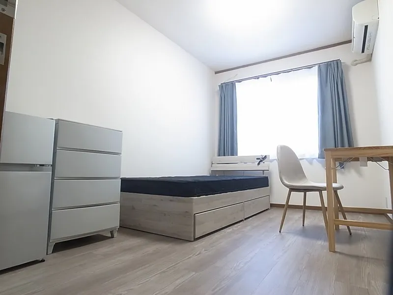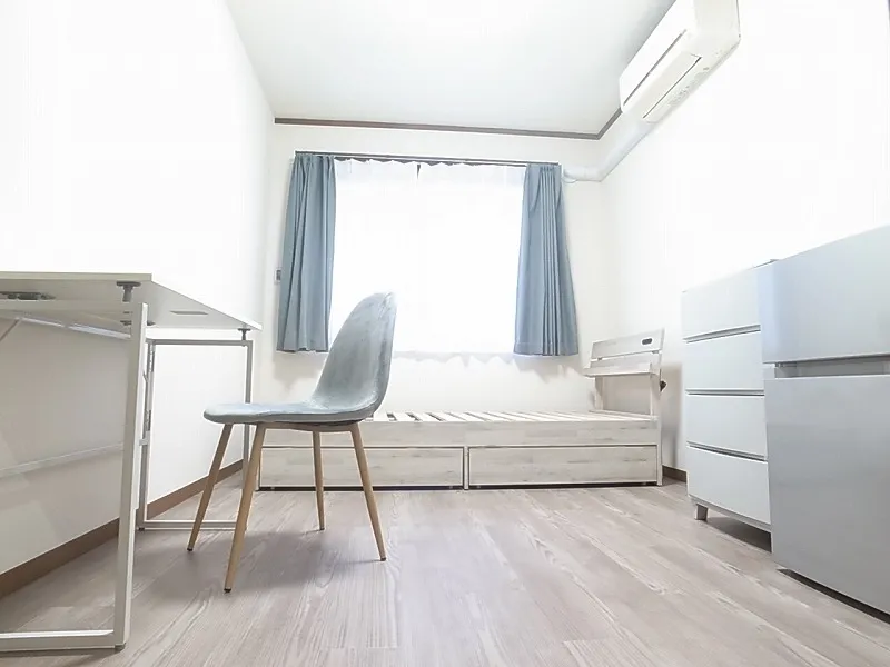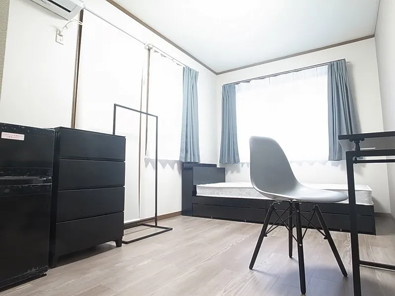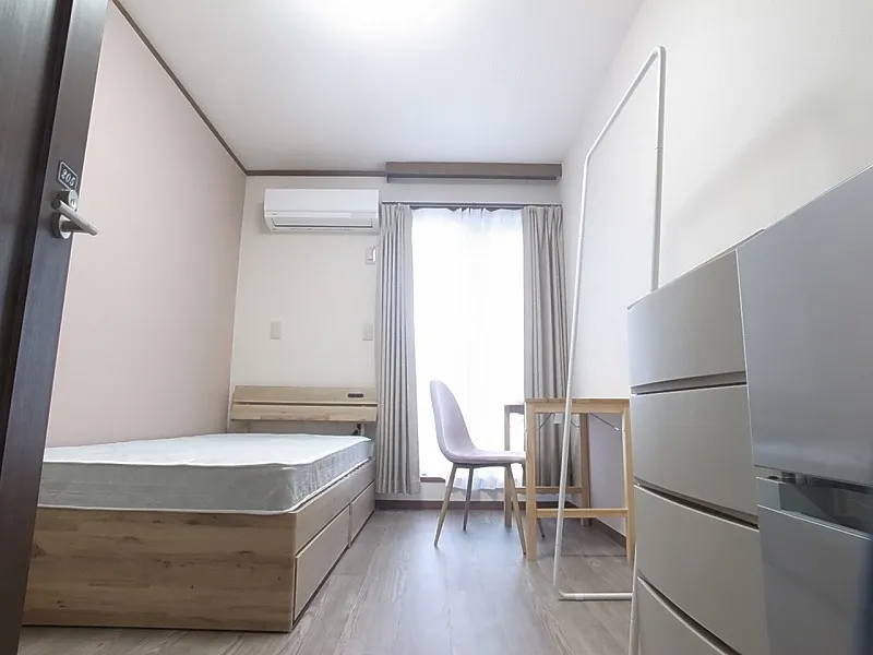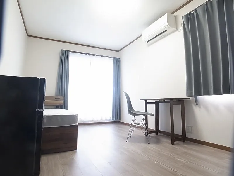 エアコン、冷蔵庫、ベッド、デスク、チェア、ハンガーラック、カーテン