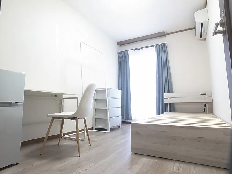 エアコン、冷蔵庫、ベッド、デスク、チェア、ハンガーラック、カーテン、バルコニー隣接