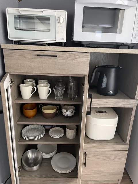 食器や洗剤、家電は自由使っていただけます。 足りない物や必要な物がありましたら相談してください。 基本はカバン一つで入居できるように考えています。