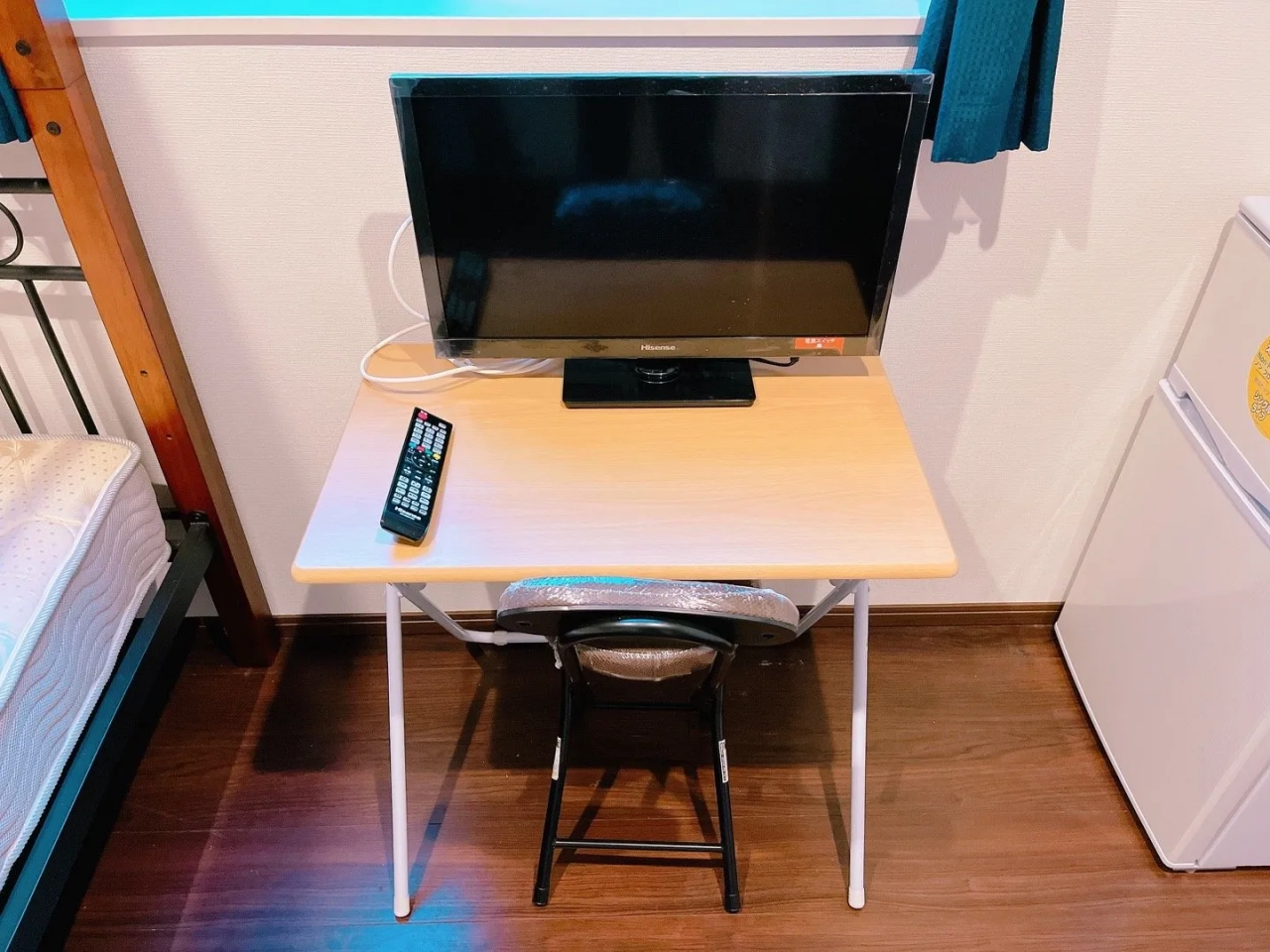 各部屋に冷蔵庫・テレビ・ベッド・机・椅子を完備しているので、身一つで入居できます!ベッド上部を活かして収納スペースにもできます!※マットレス付きます。