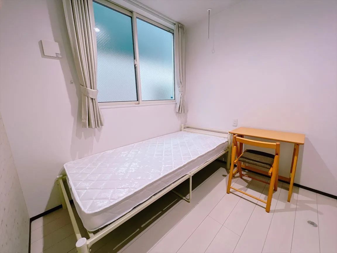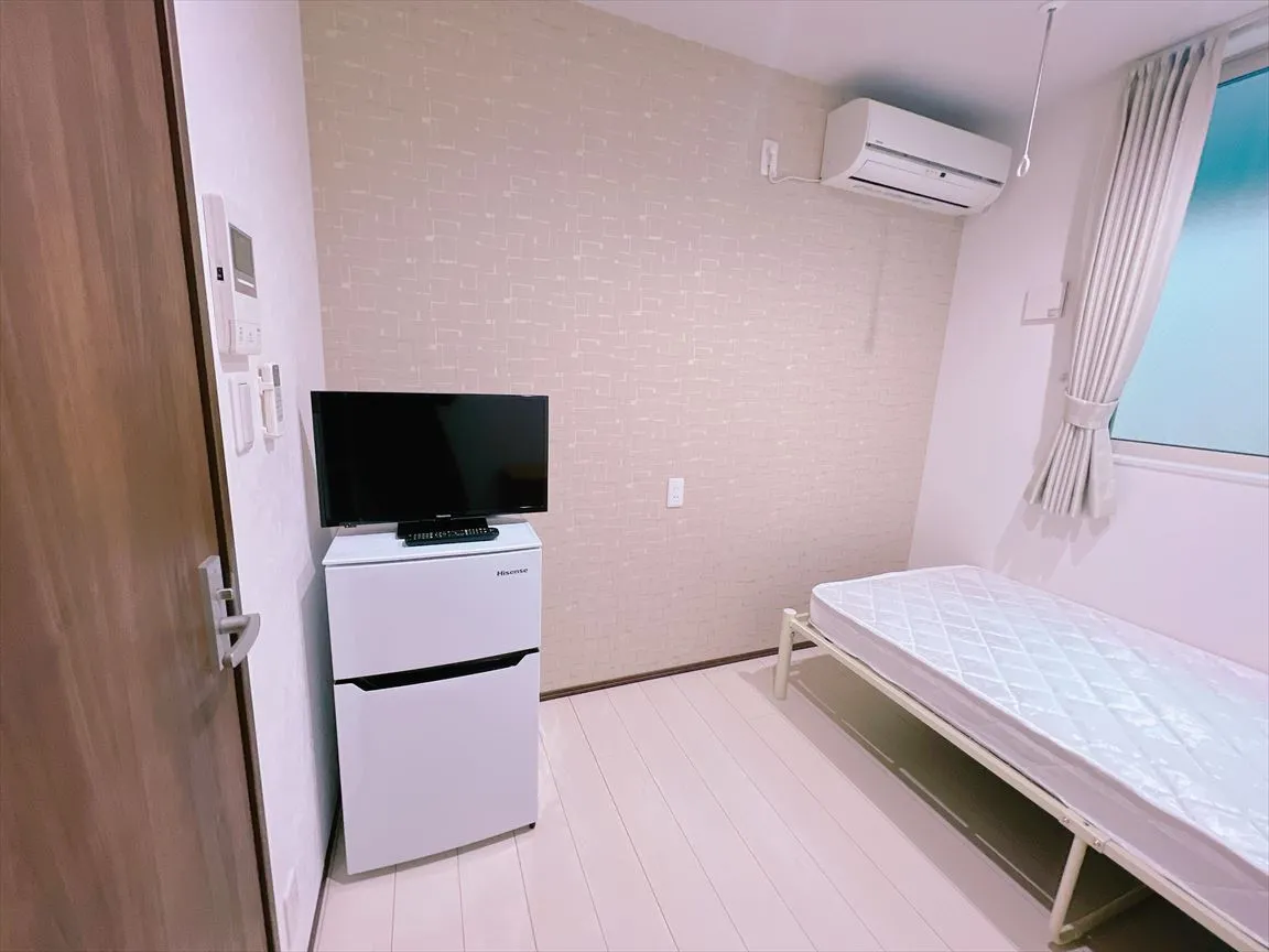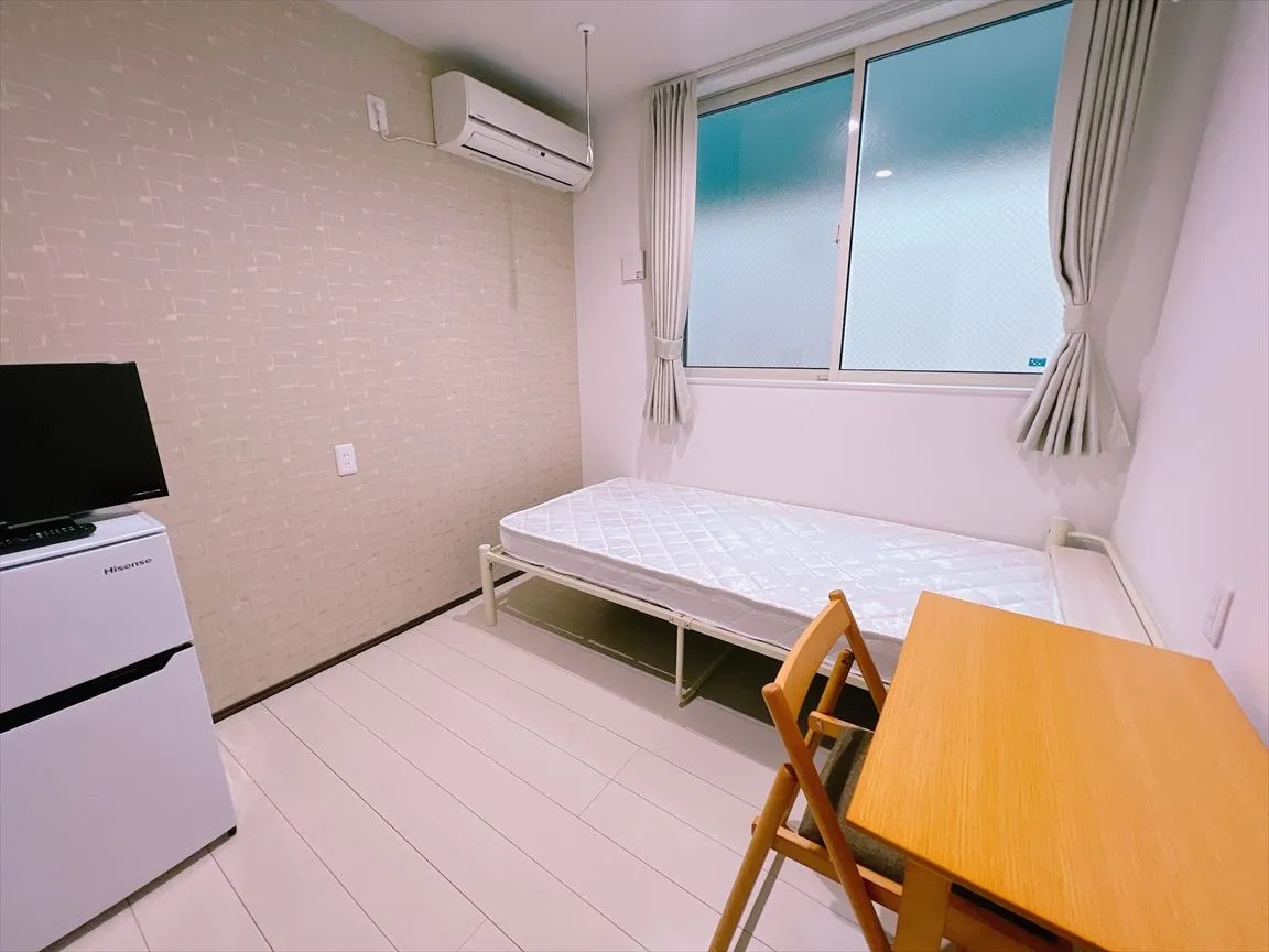 シンプルなお部屋はこちら! 各部屋に冷蔵庫・テレビ・ベッド・机・椅子を完備しているので、身一つで入居できます!