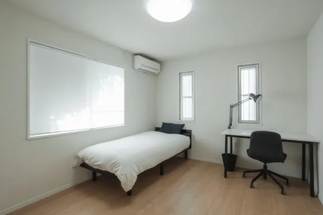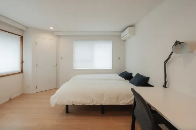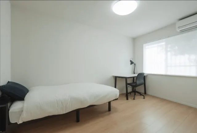 こちらのお部屋はカップルやご夫婦の2人暮らしに最適です。クイーンサイズのベッド、机と椅子、ウォークインクローゼット、小さな勉強部屋が揃い、快適にお過ごしいただけます。