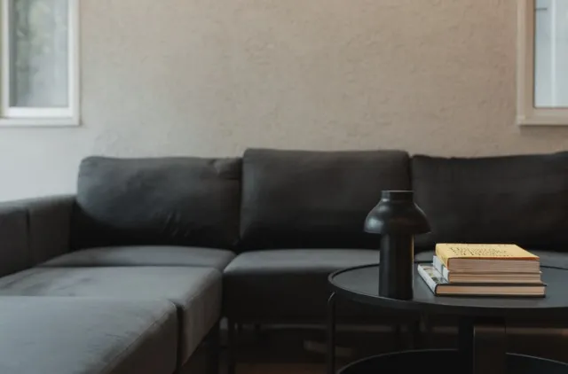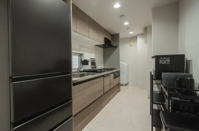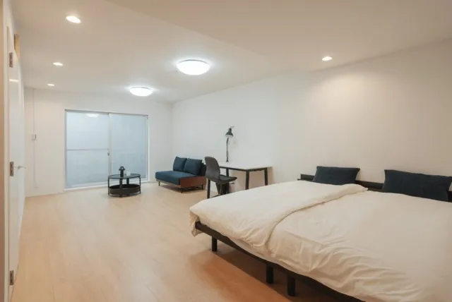 こちらのお部屋はカップルやご夫婦の2人暮らしに最適です。クイーンサイズのベッド、机と椅子、大きいハンガーラック、ソファーとローテーブルが揃い、快適にお過ごしいただけます。