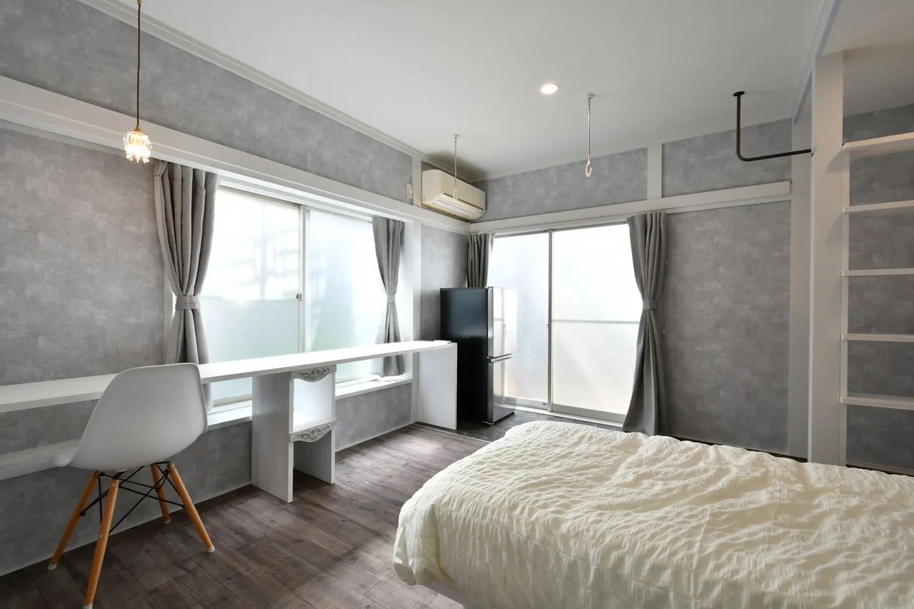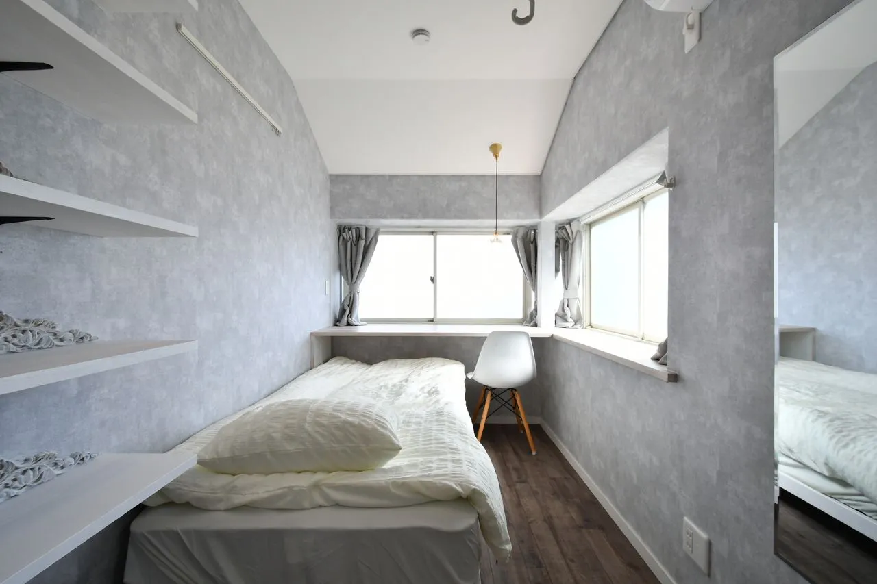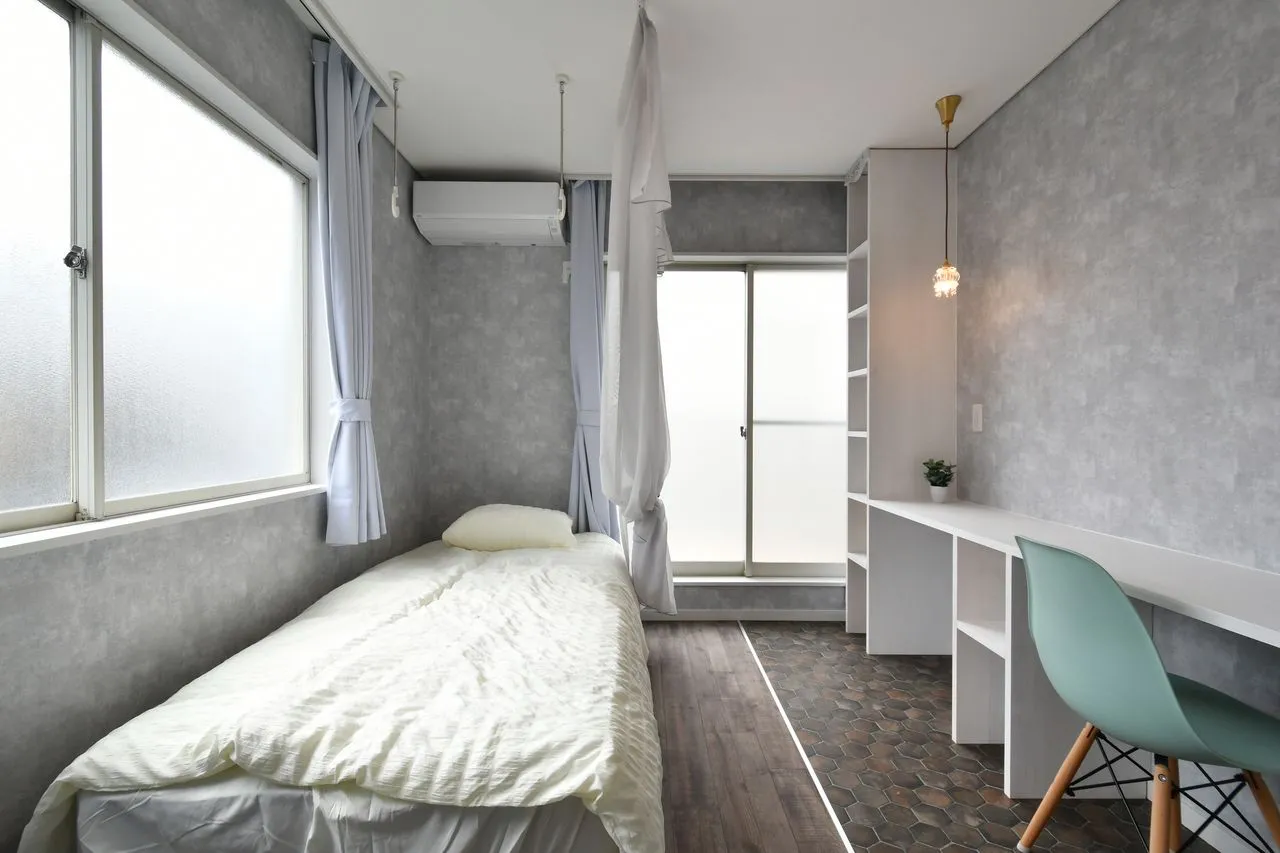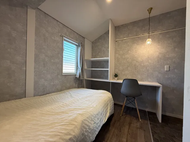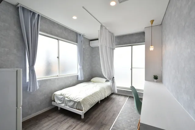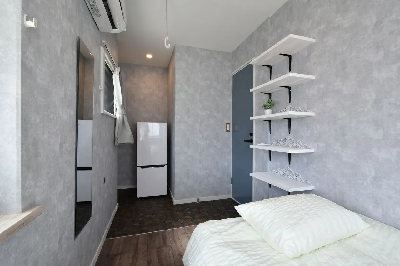 2025年秋に室内改修を実施したシェアハウスのご紹介です。最寄りは京急線・黄金町駅で徒歩圏内(約12分)。横浜駅へもバス利用でおよそ16分と、主要エリアへのアクセスが良好です。住戸全体は明るいホワイトとニュアンスグレーでまとめ、クラシカルさを感じさせる落ち着いたデザインを採用。各個室には備え付けのカウンターデスクと収納スペースを設置しており、テレワークや学習用途にも対応可能です。共用エリアは自然な色味とシンプルな内装で構成し、入居者がリラックスして過ごせる空間を意識しました。ブルーがかったグレーの扉がアクセントとなり、住まい全体に上品な印象を与えています。