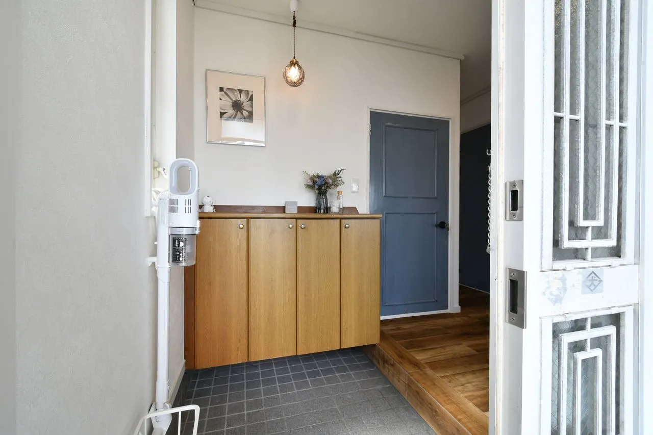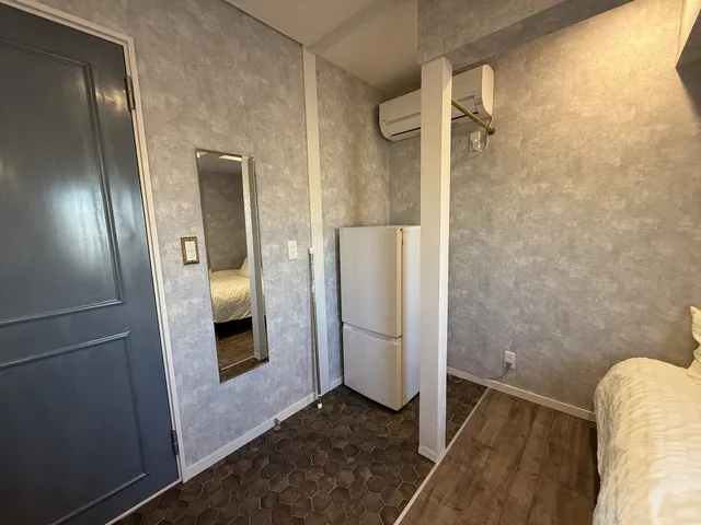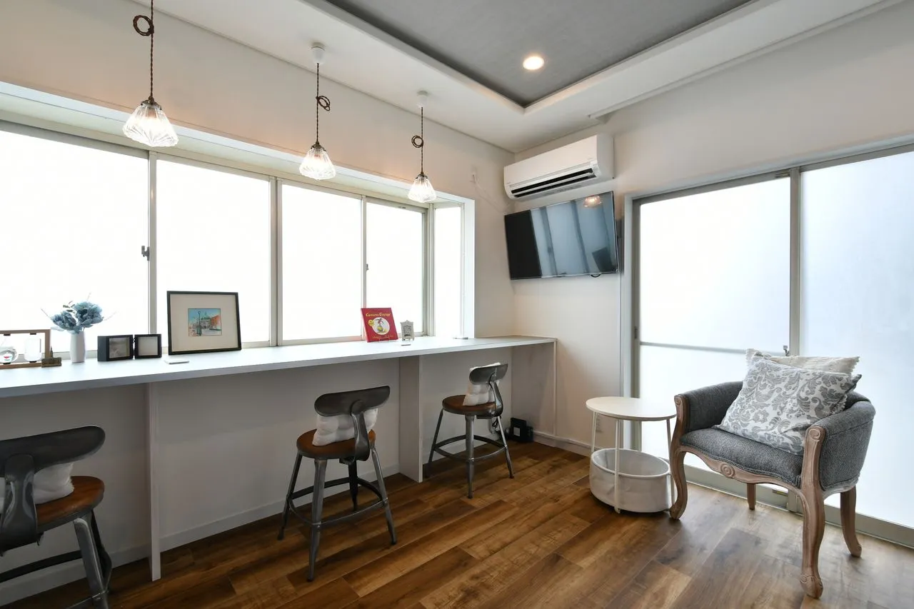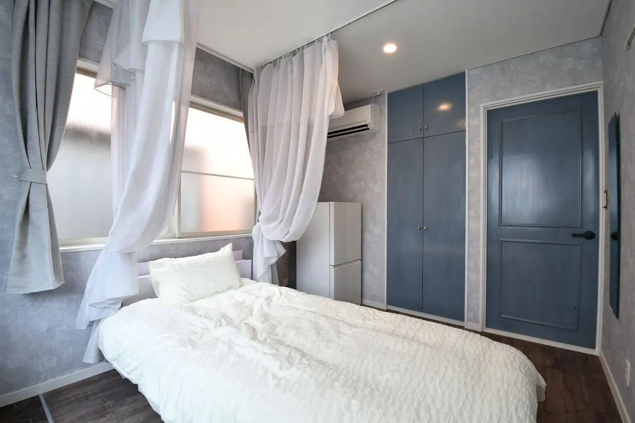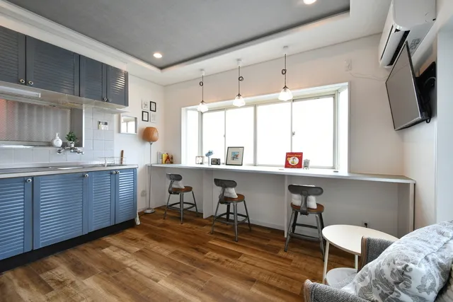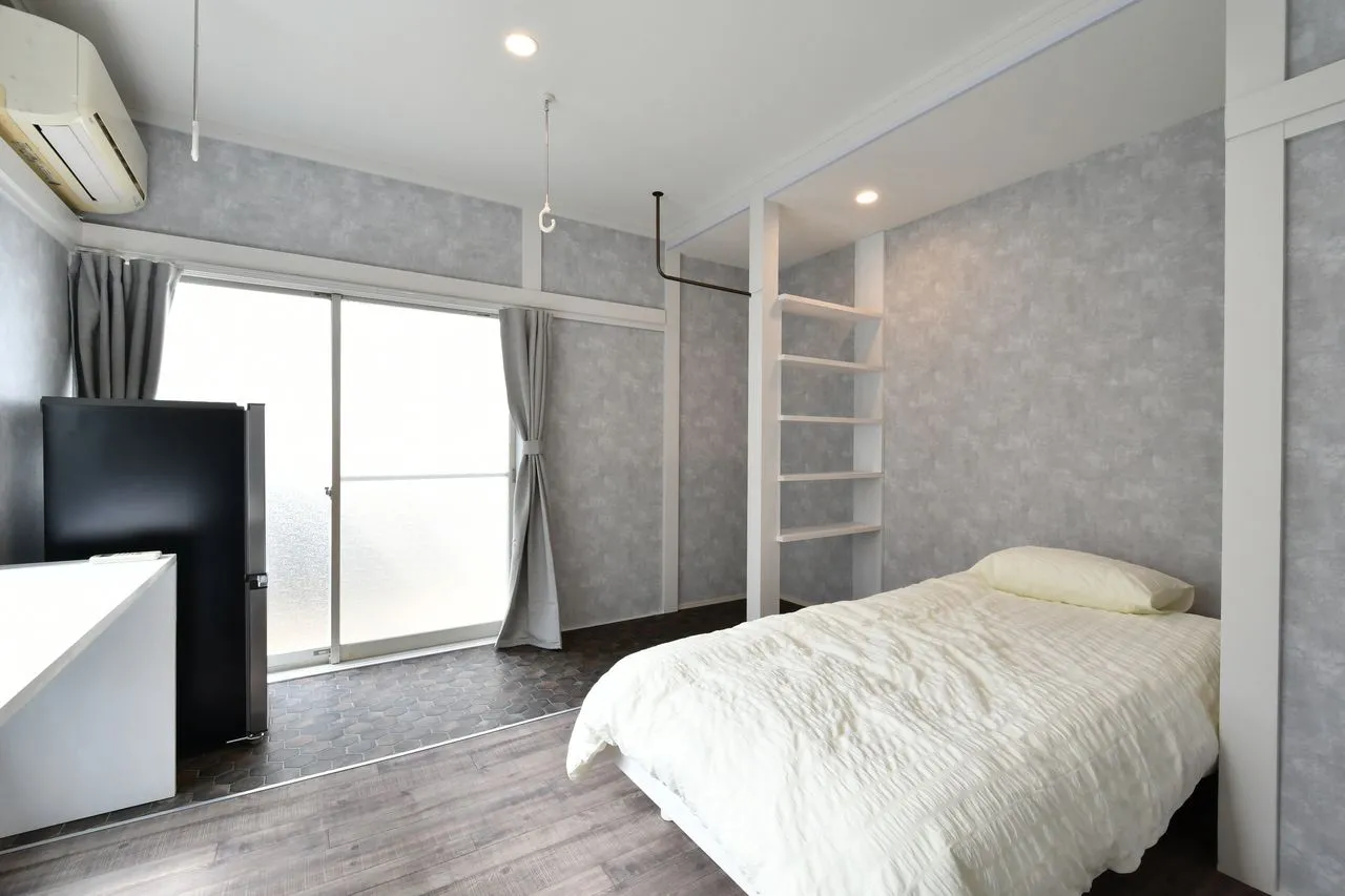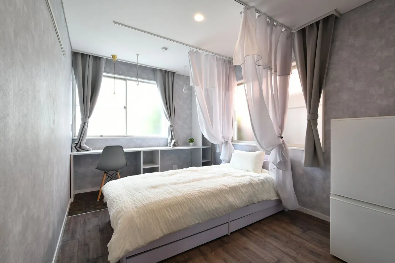 2025年秋に室内改修を実施したシェアハウスのご紹介です。最寄りは京急線・黄金町駅で徒歩圏内(約12分)。横浜駅へもバス利用でおよそ16分と、主要エリアへのアクセスが良好です。住戸全体は明るいホワイトとニュアンスグレーでまとめ、クラシカルさを感じさせる落ち着いたデザインを採用。各個室には備え付けのカウンターデスクと収納スペースを設置しており、テレワークや学習用途にも対応可能です。共用エリアは自然な色味とシンプルな内装で構成し、入居者がリラックスして過ごせる空間を意識しました。ブルーがかったグレーの扉がアクセントとなり、住まい全体に上品な印象を与えています。