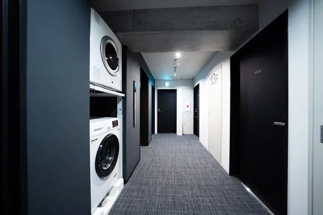 各フロアに1台、洗濯機と乾燥機が設置されております! 無料で使えます!