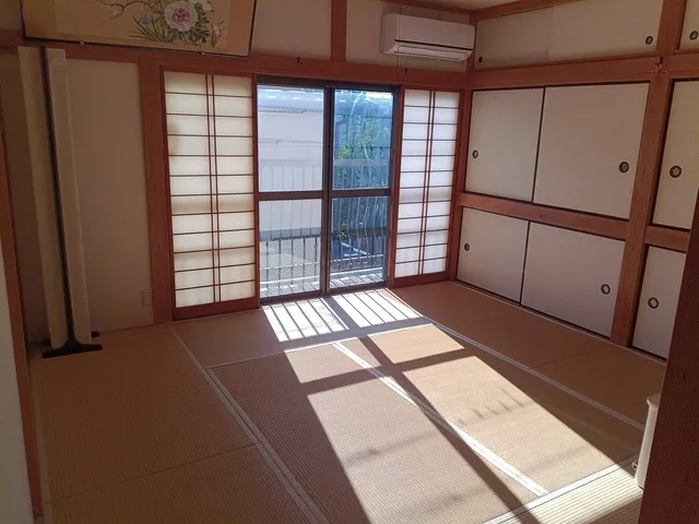 ベランダ付き、南向き窓部屋、天袋付きの大きな押入れ×2、和室8畳、2人入居可(共益費10000追加)、可動式ジャバラパーティション、寝具、こたつ、座布団、椅子付き