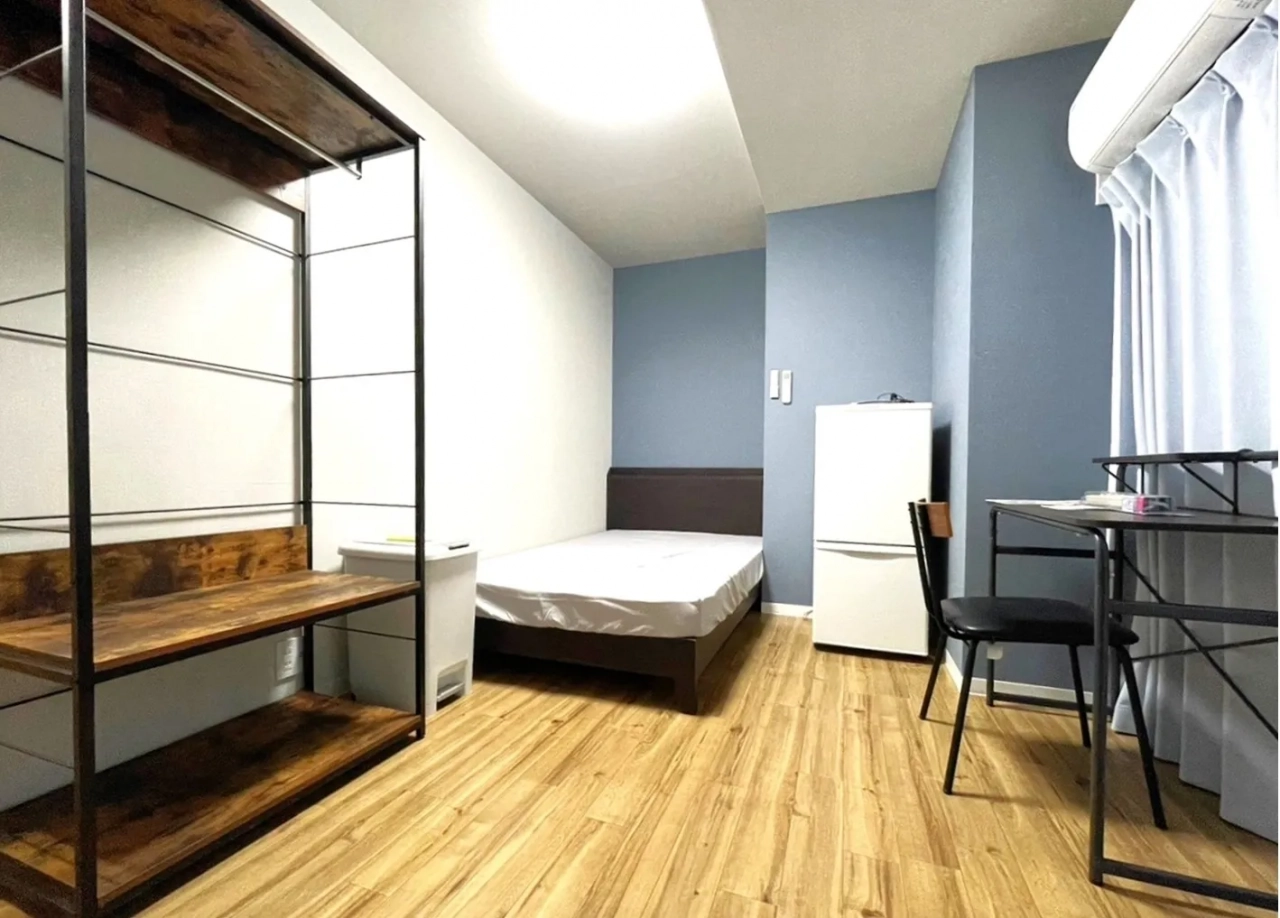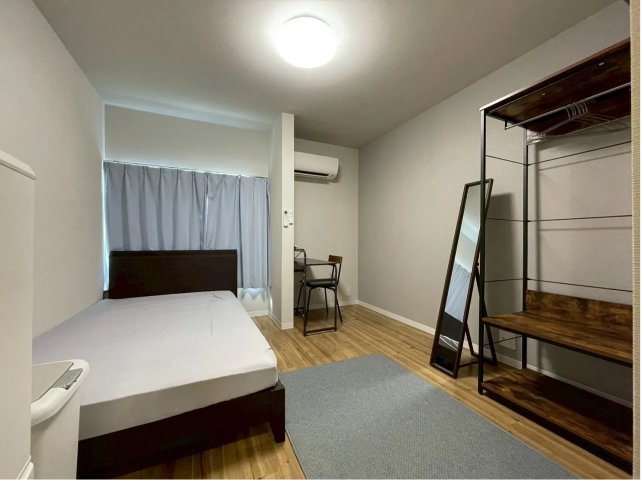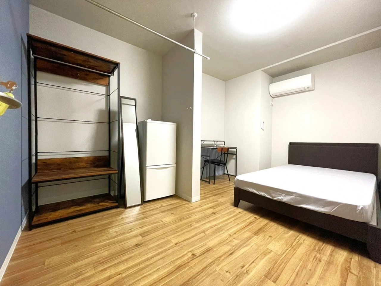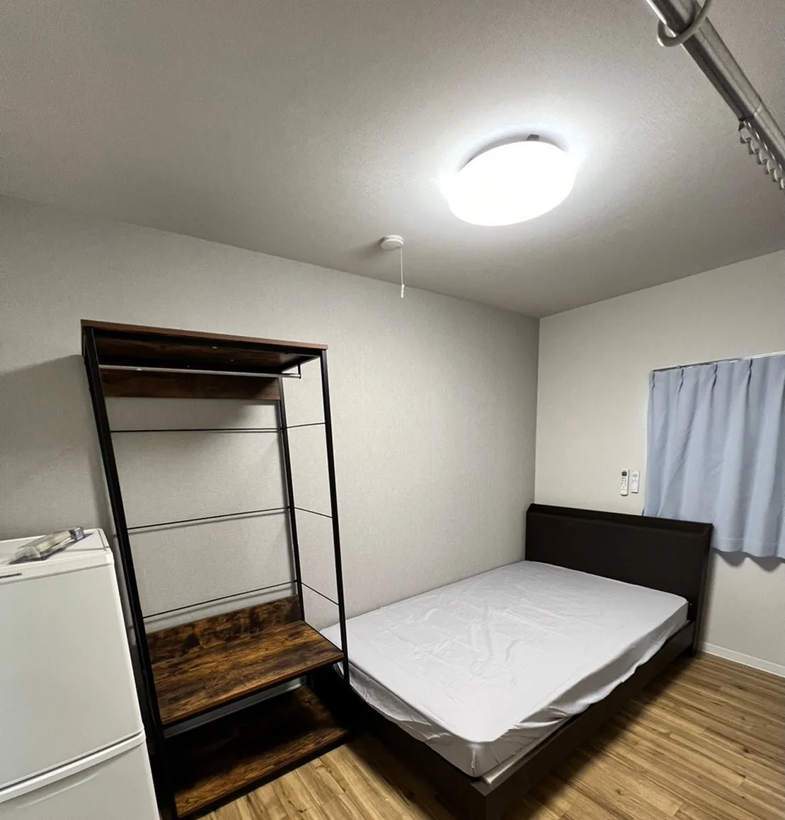 部屋設備:エアコン、冷蔵庫、ベッド、机、椅子、ハンガーラック、室内用物干し竿