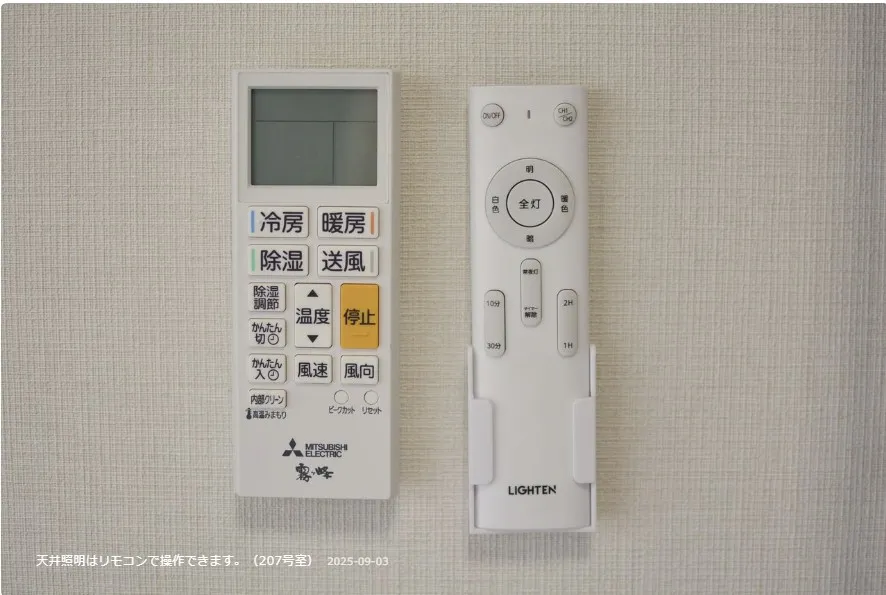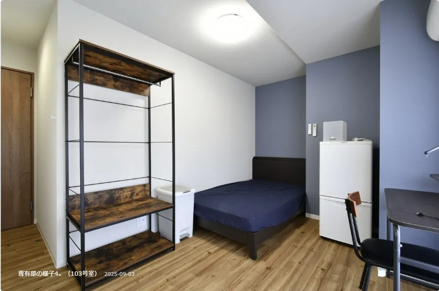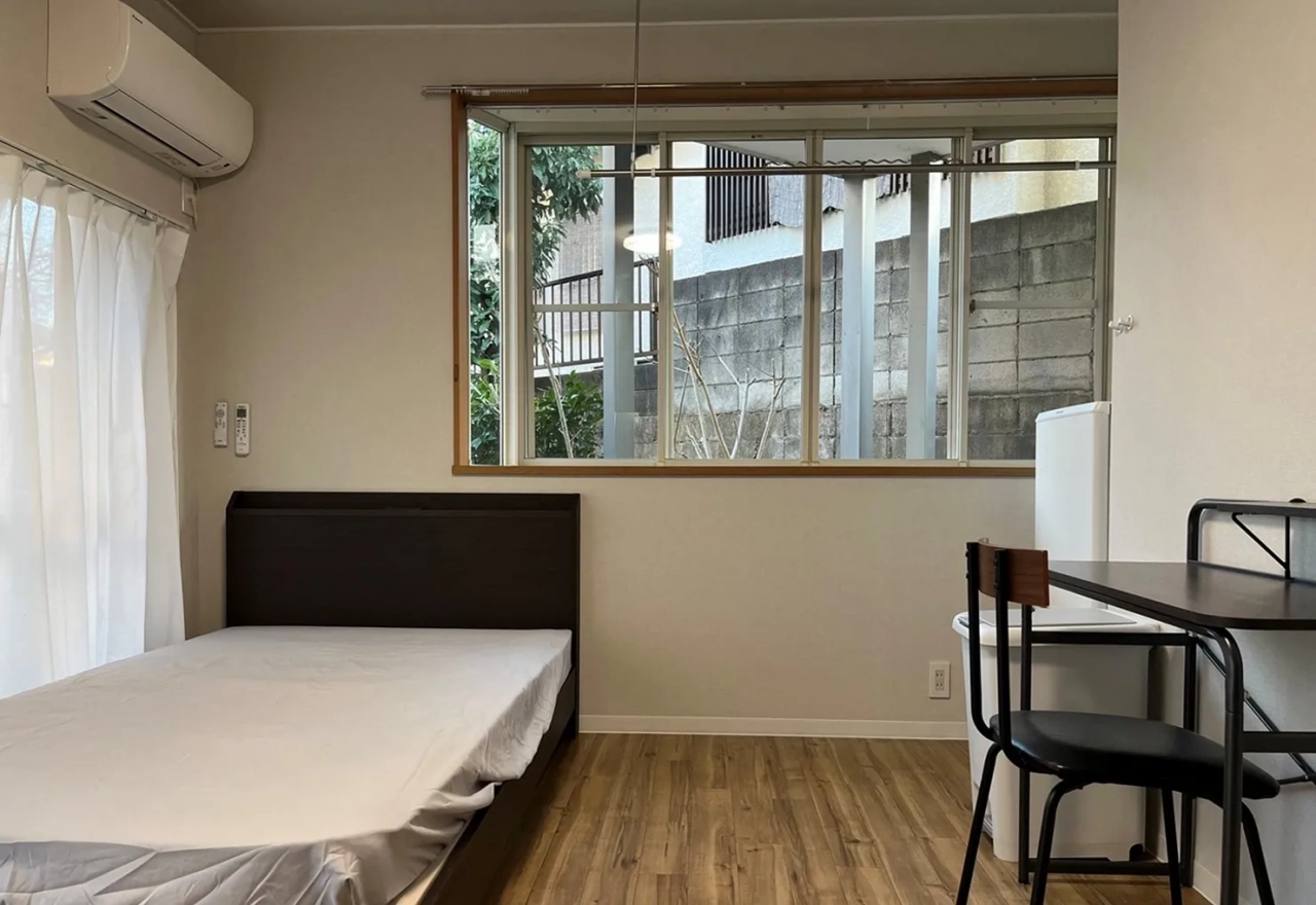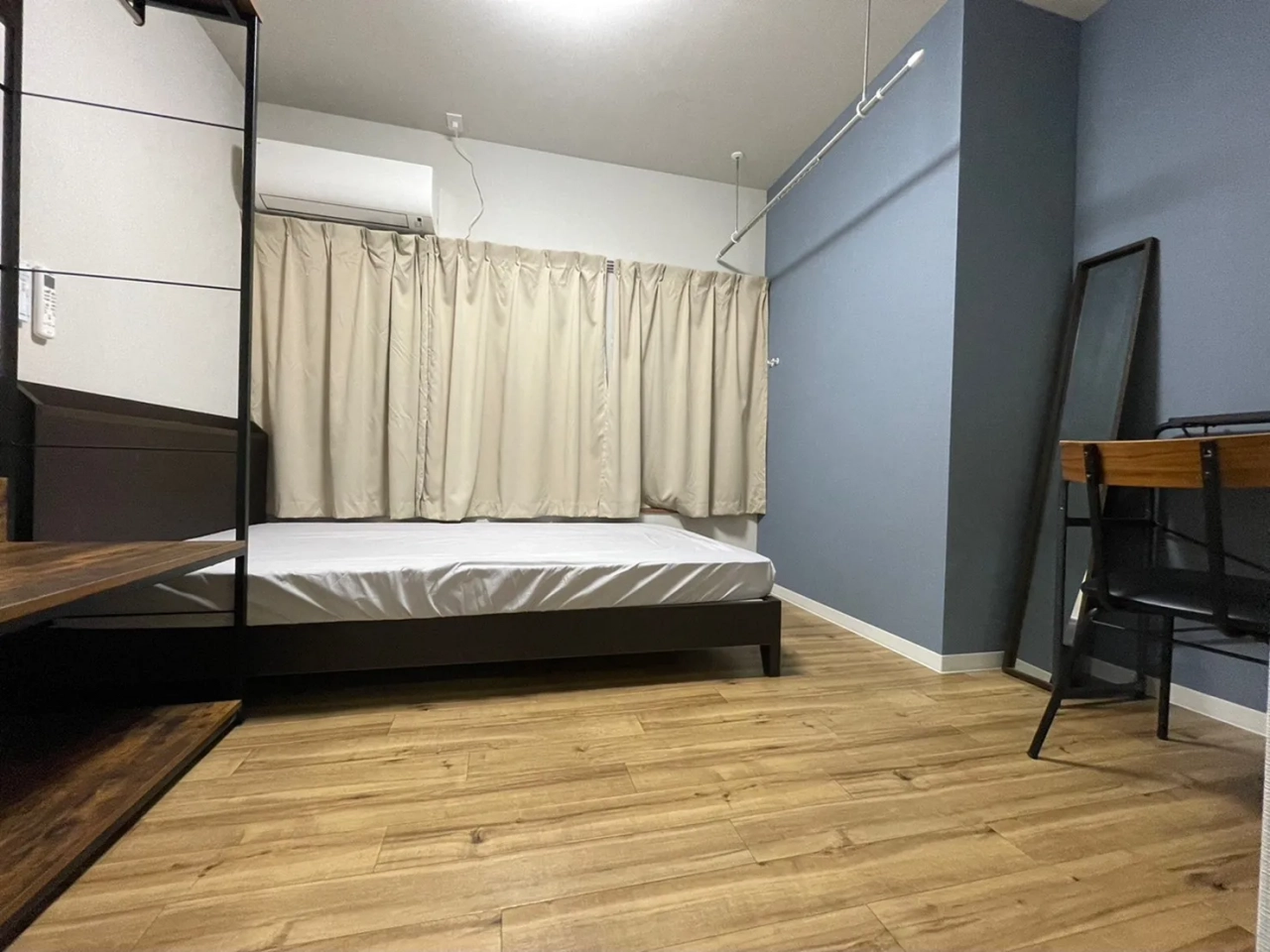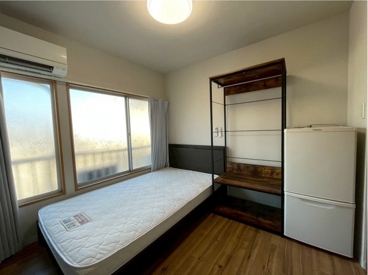 部屋設備:エアコン、冷蔵庫、ベッド、机、椅子、ハンガーラック、室内用物干し竿