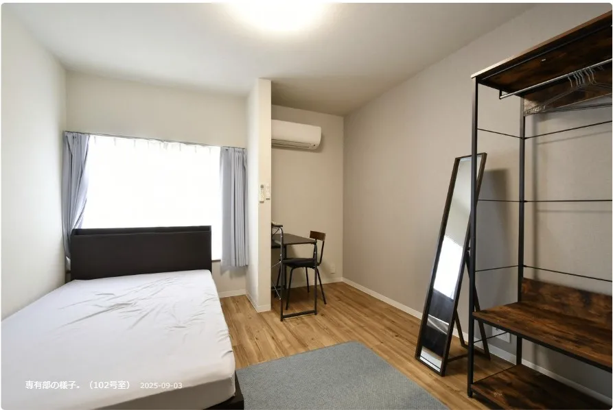 全部屋7㎡以上と広めの個室は、プライベート空間を充実させられます!また、全部屋家具家電付き(冷蔵庫・ハンガーラック・ベッド・デスク・エアコンなど)なので引っ越しの初期費用も抑えられます。