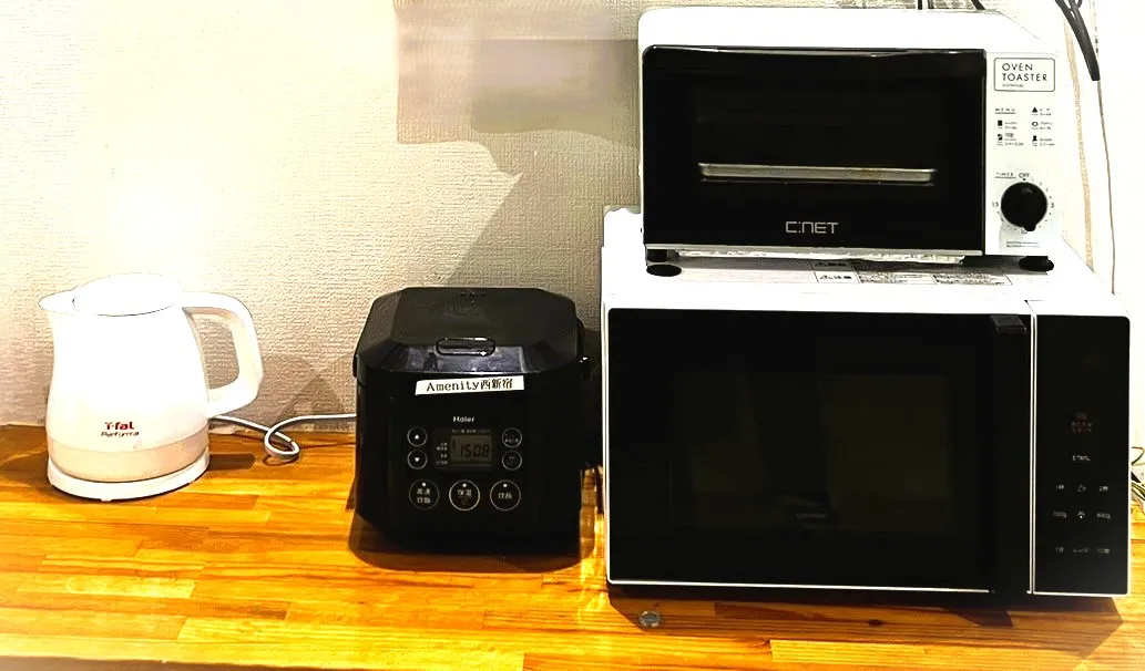 共用部にはキッチン、電子レンジ、トースター、炊飯器、調理器具を完備