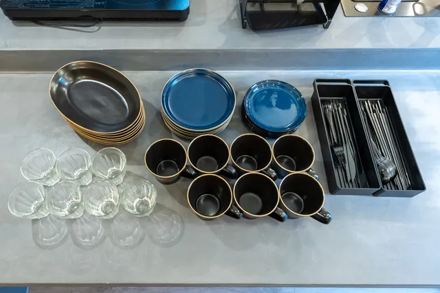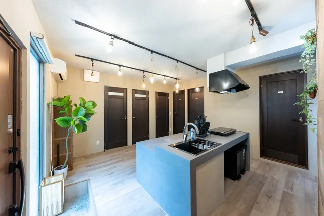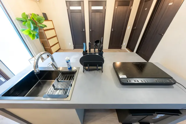デザイン性の高いキッチンは、このハウスの魅力のひとつ。広々としたスペースで料理がしやすく、入居者同士の自然な交流も生まれやすい空間です。