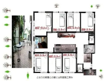 - 【入居者特典!!】無料スタジオ、無料洗濯機、無料乾燥機、無料駐輪場、敷地内休憩所4箇所